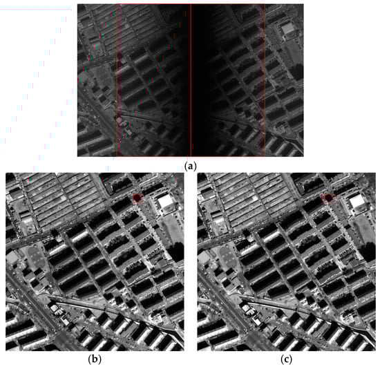 Figure 17 shows the raw and corrected images of the city. Figure 17a shows the raw image produced by two CCDs. Figure 17b–d shows the results of correction using the laboratory coefficients, the on-orbit coefficients and the proposed method, respectively. Analysis of the visual effects in Figure 17 revealed no difference among methods in correction of the city image. These three methods performed well in correcting the vignetting area on the raw image of the city. As shown in Figure 17, the information from the vignetting area was completely corrected, which aided subsequent interpretation and the fulfillment of other requirements.