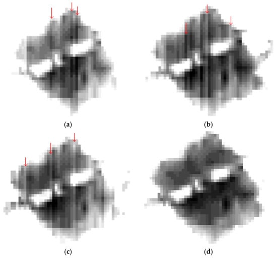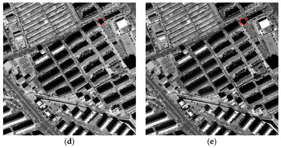 There are a large number of shadowed areas in the city image as shown in Figure 17. These shadowed areas belong to the low brightness region. Figure 18 shows the details of the red box shown in Figure 17, and the shadowed areas are stretched. Figure 18 shows the details of the four methods in the low-luminance region of the shadow, where the red arrow indicates that the column belongs to the streaking, as can be seen from Figure 18a–c, while the shadowed area in Figure 18d has no streaking. It can be seen that the proposed method performs better in the correction of low brightness, even though the corrected images of using the four methods seem uniform.