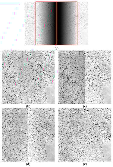 Figure 20 shows the raw and corrected images of the desert. Figure 20a shows the raw image produced by two CCDs. Figure 20b shows the streaking. Figure 20c,d shows the results of correction using the laboratory coefficients and the on-orbit coefficients, respectively. Figure 20c,d shows that the effects of correction were not satisfactory, while Figure 20e shows a better result. Visual analysis of the water, city, hill and desert images indicated that correction using the laboratory coefficients and the on-orbit coefficients was not ideal in areas with less texture, such as those depicting water and desert scenes. However, correction was effective for targets with more texture, such as the city (Figure 17). Compared with the effect of correction using the laboratory coefficients and the on-orbit coefficients, the proposed method performed well for all four types of subject images. The on-orbit coefficients did not perform well on the water image and the desert image. The proposed method showed better performance than the method based on the laboratory coefficients and on-orbit coefficients and improved the uniformity of the images and the quality of the vignetting areas. To analyze the correction effect better, quantitative analyses of the corrected images were performed.