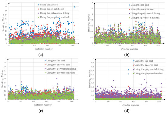 Figure 21 shows the distribution of streaking metrics for images corrected by the laboratory coefficients, the on-orbit coefficients, polynomial fitting and the proposed method. The abscissa represents the detector number, and the ordinate represents the streaking metrics, where the blue dots represent the results obtained using laboratory coefficients, red dots represent the results obtained using on-orbit coefficients, purple dots represent the results obtained using the polynomial fitting and green dots represent the results obtained using the proposed method. Smaller streaking metrics values reflect greater image uniformity. Figure 21a shows the distribution of streaking metrics for the water image. The streaking metrics for the results obtained using the laboratory coefficients were distributed mainly between zero and one, and those for the image corrected by the proposed method were distributed mainly between zero and 0.4. Figure 21b shows the distribution of streaking metrics for the city image corrected by the other coefficients and the proposed method. The distributions ranged from 0–0.8 for both methods. Figure 21c shows the distribution of streaking metrics for the hill image. The streaking metrics between the 200th-detector and 400th-detector were generally greater for the image corrected using the other coefficients than for that corrected using the proposed method. Figure 21d presents the distribution of streaking metrics for the desert image corrected by these four methods. The streaking metrics were distributed roughly between zero and 0.3; while the streaking metrics of the image corrected using the proposed method were generally below 0.1, which is obviously superior to the other three coefficients. For the desert image, the streaking metrics of the corrected image using the polynomial fitting were largest. These results indicate that the proposed method is superior to the methods using the laboratory coefficients, the on-orbit coefficients and the polynomial fitting, such as water and desert. For the city images, the streaking metrics do not differ markedly between correction using the other methods and the proposed method. However, the maximum streaking metrics values are significantly greater for the images corrected using the other two coefficients than for those corrected using the proposed method.
