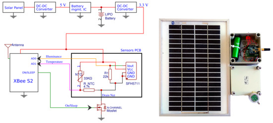The main PCB holds the circuitry for interconnection among elements, including a battery management integrated circuit for safe charging of the Li-Po battery (2300 mAh, 3.7 V), a switching voltage regulator to power up the radio module and the signal conditioning circuitry and a N-channel MOSFET used as switch to power up the sensors PCB only when is needed, avoiding unnecessary battery drain. The radio module is also assembled to the main PCB, and both allocated inside an IP66 box together with the Li-Po battery. A power switch is added to the box for manual activation. The sensor PCB is placed inside a transparent case glued and sealed with silicone to the upper side of the IP66 box to allow direct light measurements. Finally, the PV solar panel (5 Wp) is also situated outside the box.