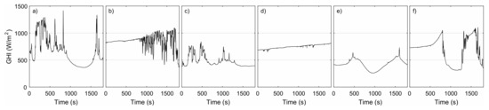 Six examples of real irradiance profiles used for calibration. The starting dates and times expressed in UTC+2 in each case: (a) 7 June 2018 13:20:42; (b) 8 June 2018 11:21:49; (c) 9 June 2018 09:48:22; (d) 9 June 2018 10:44:52; (e) 10 June 2018 12:35:15; and (f) 11 June 2018 11:00:46.
