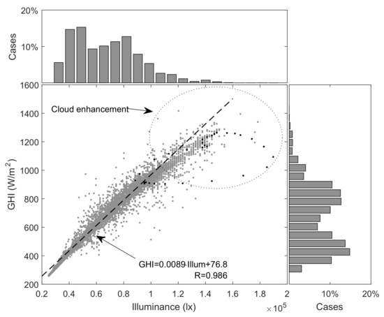 - Tapakis, R.; Charalambides, A. Enhanced values of global irradiance due to the presence of clouds in Eastern Mediterranean. Renew. Energy 2014, 62, 459–467. [Google Scholar] [CrossRef]