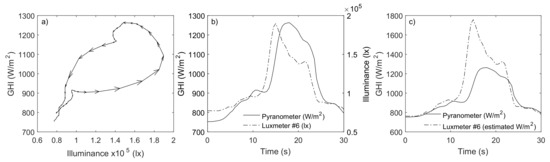 The scatter plots used in the calibration process present peculiar curves that, to a greater or lesser extent, are responsible for a relevant part of the dispersion observed between the pyranometer and mote registers. These curves were also reported by Schenk et al. and interpreted as anomalous behavior of some lux-meters. The result was the exclusion of these sensors from their solar sensor network despite the promising results in some cases and the low investment costs [13]. These anomalous curves can be produced by the different time response between the pyranometers and lux-meters: the former in the range of seconds and the latter in the range of milliseconds. To illustrate, Figure 4a shows one of these curves extracted from the scatter plot of Figure 3. The arrows indicate the sequence of the 61 selected points, corresponding to a period of 30 s (sampling frequency of 2 Hz). Figure 4b reproduces the concerned GHI and illuminance measurements in the time domain. The selected interval covers a moment of clear sky between clouds. Figure 4b shows how the lux-meter captured the drastic changes approximately two seconds before the pyranometer reaction. Thus, in a first step, there is an increase of luxes without increase of irradiance, which produces a horizontal trajectory in the scatter plot (Figure 4a). As pyranometer reacts, the trajectory becomes more vertical. Following the sequence of measurements, the entire curve can be reproduced. Finally, as the values remain stable due to the presence of the new cloud, the points converged to the initial ones. Besides the commented “delay”, Figure 4b also shows how the lux-meter measurements present more details, while the pyranometer measurements are smoother. The illuminance-to-irradiance conversion described above allows to compare the performance of both sensors (lux-meter #6 and pyranometer) in terms of irradiance, as represented in Figure 4c. The longer time response of the pyranometer acts as a low-pass filter that smooths fast irradiance variations, thereby omitting irradiance events that occurs in shorter time scales. The lux-meter is able to capture these rapid changes, registering remarkable features as irradiance peaks 50% higher than the ones measured by the pyranometer. Under stable conditions or slow variations of irradiance, both sensors provide similar measurements. These results indicate that lux-meters can provide measurements more representative of the PV-cell behavior in the sub-second range, thereby being even more suitable than pyranometers for monitoring systems at these scales.