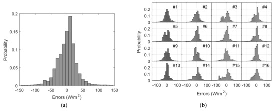 Figure 5a shows the error distribution resulting from the aggregation errors from the 16 motes, which provides a general characterization of the expected accuracy in these sensors. The error distribution presents a standard deviation of 36.1 W/m, being the 95% of errors within a range of 68.1 W/m. The mean absolute error is 24.4 W/m. Figure 5b and Table 2 shows the individualized results for each mote. It is worth mentioning that these errors provide a conservative characterization of the mote’s performance, since they include the commented deviations derived from the time response that, in some sense, can be interpreted as pyranometer’s errors. Anyway, for characterization purposes, the pyranometer data have been considered as an exact reference. In this sense, the observed errors also compute the effects of all the uncertainty sources that affect the measurement chain: data acquisition strategy, transmission problems or different performances under different atmospheric conditions. The obtained uncertainty is thereby a characterization of the performance of the motes and the monitoring system as a whole. A deeper analysis on the effects of the different uncertainty sources would be matter of future work.