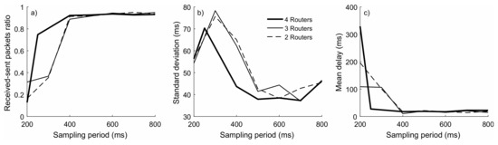 The ideal situation would be associated with a ratio of successfully received packets of 1 and a standard deviation and mean delay of 0 ms in the time reception of packets. This would imply that all sent packets are received with a regular periodicity equal to the selected sampling period. The results in Figure 6 show that sampling periods shorter than 400 ms entail an important percentage of lost packets that obviously introduces dispersion and delay in the reception of packets. With longer sampling periods, the network became stable and the performances including two, three or four routers were similar, with the received-sent packet ratios close to the unity and mean delays around 20 ms in all cases. The presence of four routers only seems to slightly benefit the regular reception of packets.
