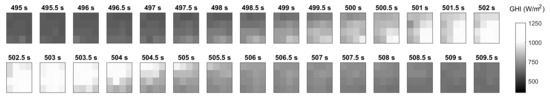 Figure 7a shows the estimated irradiances associated with the 16 motes in a period of 10 min (600 s). The measurements show consistency and illustrate about the general performance of the network under variable irradiance conditions. However, this information must be analyzed in the sub-second range to certify its utility in very short-term forecasts for small scale PV systems. In this sense, the right figure details the most significant irradiance variation in this period: a cloud enhancement event occurred between the Seconds 495 and 510. It can be observed how the event is clearly registered by all motes but with different intensity and slight temporal shift. For a better interpretation of these data, Figure 8 represents the sequence of the event according to the spatial position of each mote in the grid. This visualization clearly reveals the advance of the clouds in NW direction, which explains the temporal shift observed in the motes measurements. The sequence confirms that the sampling frequency and the density of measurement points were able to capture the cloud motion at these temporal and spatial scales.
