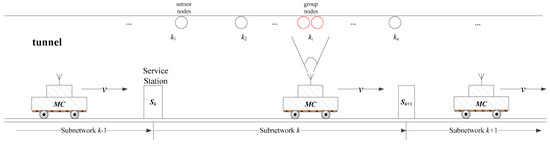 When referring to the WRSN’s problem on the ground, researchers usually consider that the sensor nodes are distributed over a limited square area. However, in our tunnel application scenarios, the nodes present zonal distribution characteristics. Furthermore, the distribution is approximately linear because the nodes are usually fixed on the top of tunnel walls, as shown in Figure 1. In some places, the nodes are distributed sparsely, while in certain interest areas, the nodes are intensive.