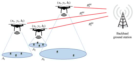 In Figure 1, the red lines represent the backhaul links between the ABBSs and the backhaul ground station and is the position of the ith UAV. As previously mentioned, these coordinates are obtained using the GPS units installed in each UAV and are sent to the central unit controlling the positions of the UAVs. is the bandwidth of the backhaul link between the ith ABBS and the ground station.