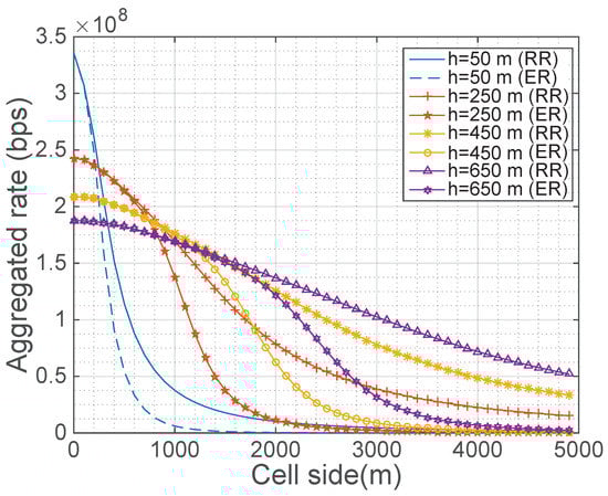 Previous works [,,,] analyze a single UAV scenario. In [], the authors developed an algorithm that finds the 3-D placement of the UAV that allows serving the maximum number of users. The other three works consider a continuously moving UAV. In [], beam division multiple access is proposed using millimeter-wave communication and the UAV is moved to combat the blockage problem and improve the user discovery. In [], three different multiple access strategies are studied, where the UAV moves in response to the users’ activities and positions. Finally, in [], the moving UAV is used as a mobile cloud to offer computation offloading opportunities to users with limited local processing capabilities. Thus, the UAV is moved to minimize the total mobile energy consumption by also optimizing the bit allocation among users for uplink and downlink communications. In previous works [,], several experiments are carried out but without considering the optimization of the altitude of the UAV.
