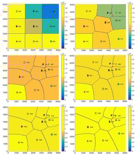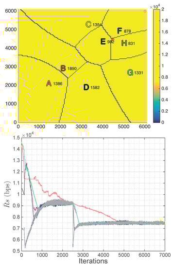 In Figure 7, this displacement of the Gaussian can be deduced by observing the red cross. Moreover, in this figure, some UAVs seem to overlap, but it is only due to the fact that they are at different altitudes and, as a consequence, the upper UAVs serve the far users. Regarding the performance of the proposed strategy, in this case, a more unstable state is reached, in other words, the fluctuation of the rate per user at each region is higher. It is produced by these closer UAVs placed at different altitudes (C, F, E and H), as in this situation a small movement of the UAVs implies a higher variation of the number of associated users. However, this fluctuation is not very high and does not affect the final results of the strategy, as both the achieved fairness and the rate per user are still high (0.99995 and 8.82 kbps, respectively), and all the constraints are still fulfilled on average.