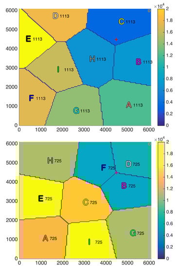 This association policy implies a partition of the given area in P regions, each one denoted by , where P is the number of deployed UAVs and each region contains all the users associated to each UAV. According to this, the received rate per user depends on the capacity delivered by its serving UAV, the number of users in the same region and their positions.