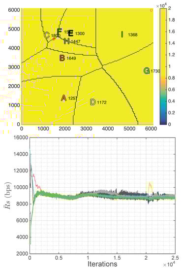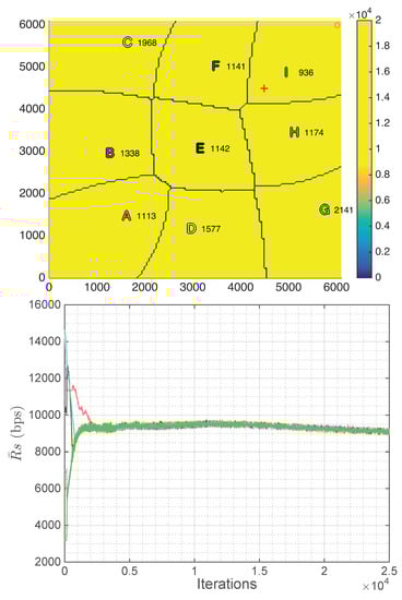 Regarding the constraints imposition, although in some iterations there can be unfulfilled constraints, the most important thing is that all of them are fulfilled on average to ensure a proper distribution of the resources. After 3000 iterations the links achieve the following average backhaul capacities : 100.01, 111.87, 124.36, 111.77, 143.38, 155.72, 124.57, 155.99, and 173.29 Mbps, which are only slightly higher than their average aggregated rate : 99.31, 106.43, 107.31, 106.28, 139.58, 150.30, 106.99, 151.51, and 135.75 Mbps. The average total shared backhaul bandwidth (179.94 MHz) is lower than total backhaul bandwidth (180 MHz). Thus, analyzing the results after 3000 iterations, it can be concluded that all the constraints are fulfilled in average, even the constrains in Equation (24), which were not fulfilled in the initialization in the regions far away from the backhaul ground antenna (6100 m, 6100 m).