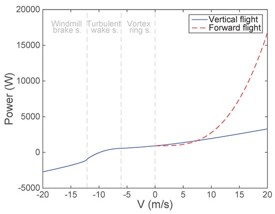 Figure 9 presents both models using an altitude of 600 m to compute the air density in Equation (49). It is important to take into account that, to show real UAV powers, the factor detailed in Equation (37) has been added in both models. By observing this figure, two important points can be extracted. On the one hand, at , both models lead to the same hovering power, which was the expected behavior and, on the other hand, for , the obtained power is negative, so the energy is extracted from the air through the reverse movement of propellers, which allows recharging the batteries.