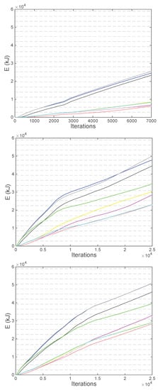 Finally, as the last step of the energy consumption evaluation, the previous models are applied in the three non-static scenarios presented in the previous section. The energy consumed per UAV over the iterations is detailed in Figure 10, where the horizontal dashed lines show the multiples of the energy of the selected UAV (2807.1 kJ).