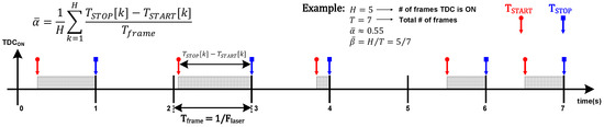 Figure 1 introduces the concepts used throughout this paper. The first parameter, , provides the average time for which a particular TDC stays activated. For example, in a noiseless system, would assume a value that corresponds roughly to the location of the target with respect to the time frame. In a noisy environment, it might assume a value closer to the middle point (), which is the average value of a uniformly distributed variation (since the noise is uncorrelated to the time frame). The presence of the signal might shift from the middle point, depending on its intensity compared to the noise. The second parameter, , is the average activity rate of one pixel, normalized to the laser frequency (). If the TDC is activated in all time frames, is one. Otherwise, it assumes a value that indicates how often a TDC is used.