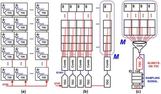 The TDCs can operate in two different modes: event-driven or sampled (continuously running TDC). In per-pixel TDC (Figure 2a), the TDCs typically operate in event-driven mode, turning on upon a photon event, and stopping by the end of the time frame [4]. In this case, from (1) can be neglected (since the pixel is connected directly to the TDC), so the total power over M pixels reduces to: