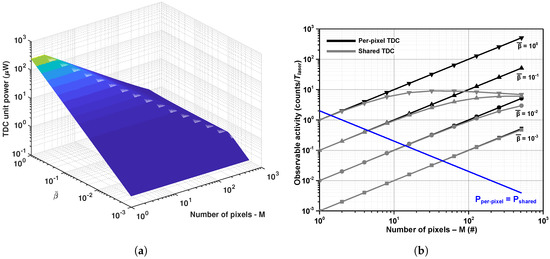 Relationship between power consumption, activity, and number of pixels. (a) Average power per TDC unit; (b) compression due to combination dead time, within a laser pulse () of 5 ns. Conditions above the blue line makes it more power-efficient to share a TDC instead of using a single TDC per pixel.