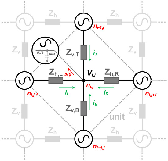 A non-linear phase macromodel is used to investigate the injection phenomenon [28]. The ROs dynamics are solved through ordinary differential equations at node , shown in Figure 4, under the influence of its neighboring oscillators, at nodes , , , , and extrapolating it to the entire system. The numerical analysis of the perturbations is based on the Floquet theory of periodically time-varying systems [29] of ordinary differential equations.