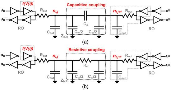 (a) Capacitive and (b) Resistive coupling elements between two generic ring oscillators (ROs) (only shown).