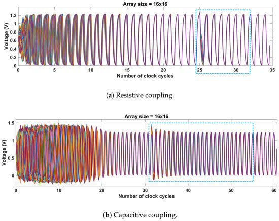 Voltage waveforms of a coupled RO network under random initial conditions and with disturbance introduced in 32 ROs in the case of (a) resistive coupling with = 250 and (b) capacitive coupling with = 240 fF.