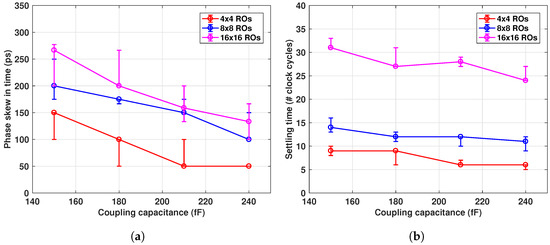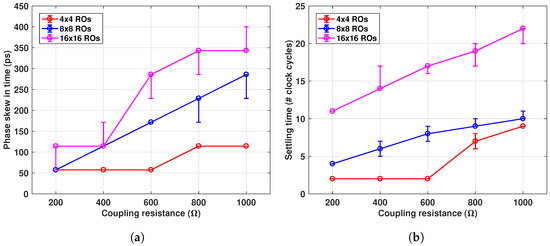 The phase skew increased with the number of coupled ROs and for lower coupling impedances. For instance, for the capacitive coupling ( = 240 fF), it took about six clock cycles for a array, to reach steady state, while it took 24 clock cycles for the array with the same , as can be seen in Figure 8b. Similarly, the same steady state parameters were obtained for the case of resistive coupling, as shown in Figure 9. A 600 coupling resistance produced a maximal residual phase skew of 280 ps for the array, while for the , the skew was only 60 ps. Higher coupling resistances also resulted in longer settling time, as shown in Figure 9b.