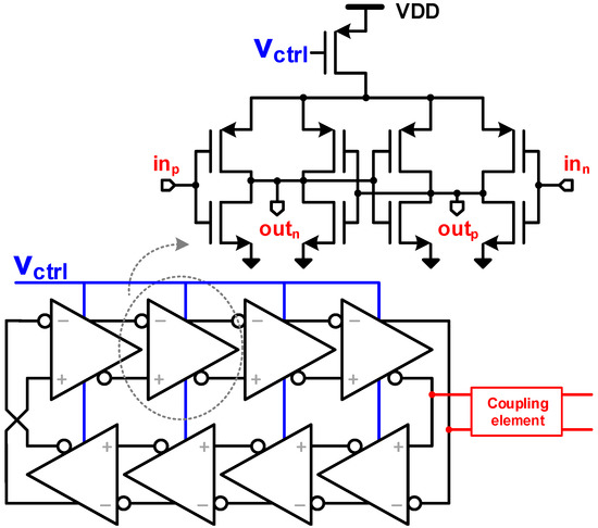The mode comprises a large-signal differential transconductance, coupled to a capacitive impedance to form each stage of the oscillator [30]. The frequency is controlled by a current source (current-starved RO) and it includes noise effects (thermal and flicker) that are naturally up-converted during oscillation. Although this model can be adapted to different numbers of stages and topology, it was designed to match the RO implemented and measured in Section 4, which is composed of an 8-stage pseudo-differential topology, as shown in Figure 10.