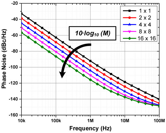 To demonstrate the described effect, multiple oscillator array sizes were coupled, and the simulation result is depicted in Figure 11. The phase noise reduction of the uncorrelated noise (low offset frequencies) behaved as predicted. For the correlated noise (high offset frequencies), such as the thermal noise on the coupling elements, the benefit of the coupling was reduced. A comparison between full SPICE and Verilog-A models was also evaluated. The latter took only 1.5% of the computational power and simulation time of the former, at equivalent precision, providing an essential tool for full chip co-simulation.