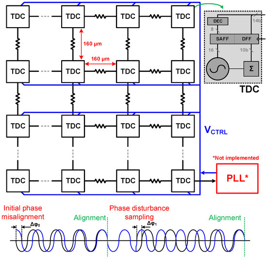 Moreover, the always-on TDC array allows uniform and (almost) constant power consumption throughout the sensor, independent of the activity, removing the IR-drop uncertainty typical of event-driven systems. A phase calibration can be performed to compensate residual skew, while PVT tracking is possible through a single PLL, using any phase in the array as reference, since all ROs will be synchronized. The proposed architecture also provides an automatic, fast, and local feedback, where disturbances in the phase of a particular RO are corrected by its neighbors, thus providing a robust, scalable approach to synchronization.