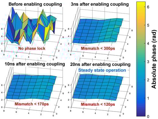 Frequency mismatches and/or PVT variation directly affect the settling time and phase skew. Variations in the coupling impedance also have an impact on the steady state. Thus, apart from ±15% variation on the RO periods, another ±10% on the coupling impedance was included in the simulations. Simulation results for the case of capacitive coupling are shown in Figure 8.