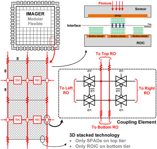 Along with the RO, a 10-bit ripple counter and D-type and sense-amplifier flip-flops complete the TDC. Based on Section 2, a single TDC was expected to be shared among two independent groups of pixels, as sketched in Figure 14. The resistive coupling used was implemented through a transmission gate, shown in Figure 14, so the performance in both modes could be compared. Moreover, it can be used to disable the coupling during initial calibration phase, where all ROs can be adjusted to roughly the same frequency, before coupling, thus improving INL and power efficiency.