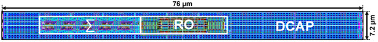 Coupled and uncoupled conditions were implemented and measured. To mimic the distribution in a real sensor, the TDCs were placed with a pitch of 160 m, horizontally and vertically, thus achieving a total area of mm. Each TDC occupied an area of m, including RO, a 10b counter, sampling latches, and decoupling capacitors, which occupied 60% of the TDC array, whose layout is shown in Figure 15.