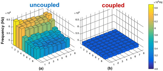 The array was measured in the whole range of frequencies, from 150 to 800 MHz. The mean values and variation bars, in coupled and uncoupled modes, are plotted in Figure 17. Before coupling, the spread in the instantaneous frequency was 22–26%, whereas under mutual coupling, this spread reduced to less than 0.11%. Moreover, under coupling and, consecutively, locking, all ROs operated in the same average frequency.