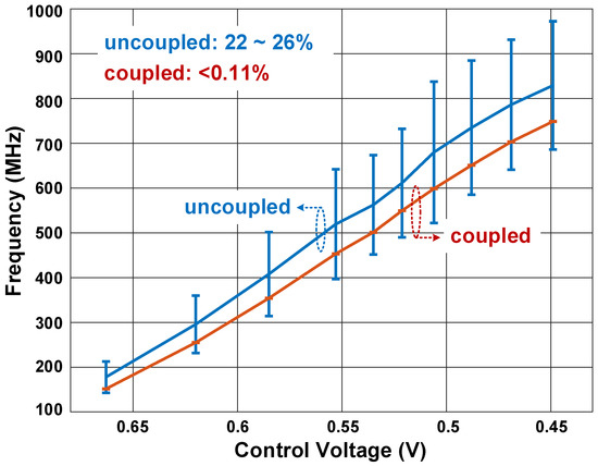 It is pertinent to observe that after coupling, the operating frequency was lower than the average of the individual oscillators, both in Figure 16 and Figure 17. The reason is the effect of parasitic capacitance from the coupling element and lines, which was only visible when coupling was enabled. For that reason, the RO was designed with asymmetric stages (stronger for the coupling phase), thus maintaining overall linearity when coupled.