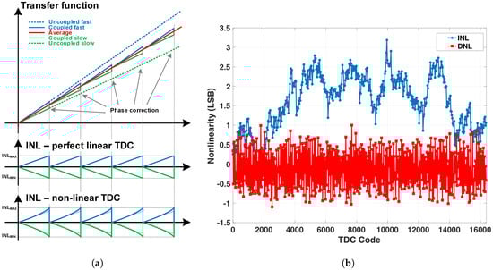 For instance, if all TDCs in the array had the same performance (the same RO frequency), by coupling them, they would present the same non-linearity as an uncoupled TDC. However, if variations were present (IR-drop, PVT variations, mismatch, etc.), they would still be locked in frequency and phase, as demonstrated in this paper, but the necessary phase alignment would cause an abrupt non-linearity, increasing the overall INL. An example phase correction is presented in Figure 18a. For an ideal case of perfectly linear TDC, but with different speed, at every RO period the phase needs to be aligned, generating a local INL whose maximum and minimum would depend on the RO period difference to the average period (). In the presence of intrinsic TDC non-linearity, will be a combination of both effects. An illustration of the local INL is shown in the bottom of Figure 18a.