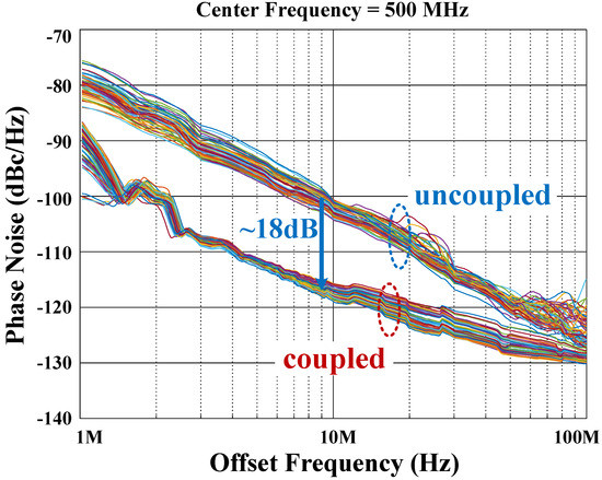 - Chang, H.C.; Cao, X.; Mishra, U.K.; York, R.A. Phase noise in coupled oscillators: Theory and experiment. IEEE Trans. Microw. Theory Tech. 1997, 45, 604–615. [Google Scholar] [CrossRef]