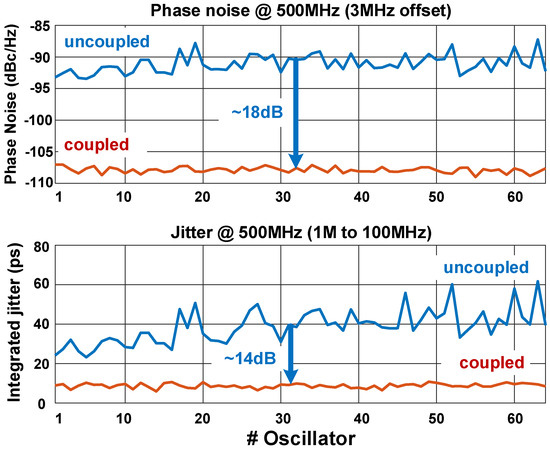 Phase noise and integrated root mean square (RMS) jitter comparison for uncoupled and coupled modes, for all 64 ROs at 500 MHz center frequency.
