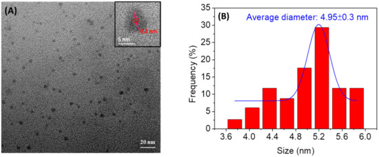 The morphology and size of N,Cl-CDs were determined by TEM. A drop of aqueous sample of N,Cl-CDs was spotted onto the ultrathin carbon film coated on a copper grid. As depicted in Figure 1A, the N,Cl-CDs are mostly of spherical morphology and evenly dispersed on the TEM image. The absence of any agglomerate of N,Cl-CDs shows the good aqueous dispersity of N,Cl-CDs. The corresponding histogram obtained by counting randomly 80 particles from various spots of the TEM image is depicted in Figure 1B. It is revealed that the N,Cl-CDs had a size range of 3.7–5.8 nm with an average diameter of 4.95 ± 0.3 nm. In addition, a magnified TEM image of N,Cl-CDs is displayed in the inset of Figure 1A. The N,Cl-CDs were revealed to have a graphitic structure with the lattice spacing of ca. 0.20 nm which is consistent with the (100) facet of graphitic structure [32,33].