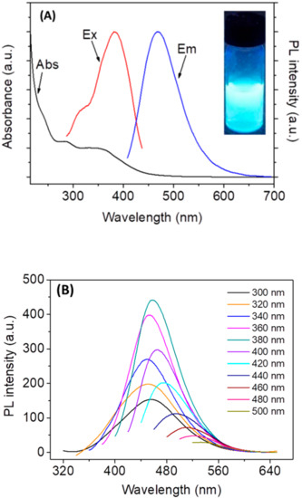 (A) The UV-vis absorption (black line), excitation (red line), and emission (blue line) spectra of N,Cl-CDs in aqueous solution (0.10 mg/mL). The inset shows the photograph of N,Cl-CDs aqueous solution (0.10 mg/mL) under UV light; (B) the PL spectra of N,Cl-CDs at different λex.