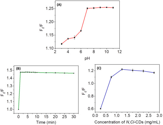 (A) Effect of pH on F0/F. 10 mM PBS solutions (pH 3‒11) were used for the experiments. The concentrations of N,Cl-CDs and Cr(VI) used were 1.25 mg/mL and 6 µM, respectively; (B) effect of reaction time on F0/F. The N,Cl-CDs and Cr(VI) were dissolved in ultrapure water, and their concentrations were 1.25 mg/mL and 6 µM, respectively; (C) effect of the concentration of N,Cl-CDs on F0/F. The N,Cl-CDs and Cr(VI) were dissolved in ultrapure water, and the concentration of Cr(VI) used was 6 µM.
