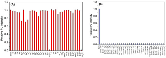 (A) The fluorescence intensity of N,Cl-CDs (1.25 mg/mL) after the addition of various metal ions and anion ions (0.5 mM); (B) the effects of coexisting ions (5 mM) on the fluorescence intensity of N,Cl-CDs (1.25 mg/mL)/Cr(VI) (0.5 mM).