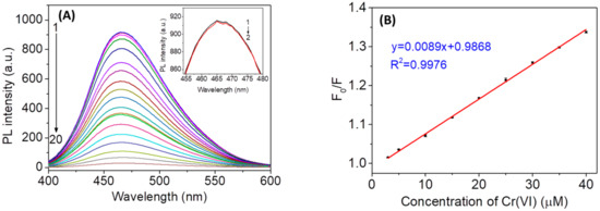 where KSV is the SV quenching constant, [Q] is the concentration of Cr(VI), and F and F0 are the fluorescence intensities of N,Cl-CDs in the presence and in the absence of Cr(VI), respectively. The KSV is calculated to be 8.9× 103 L/mol with a correlation coefficient R2 of 0.9976. The limit of detection (LOD) is calculated as 3 times the standard deviation (SD) of twelve blank measurements (n = 12) divided by KSV, and the limit of quantification (LOQ) is defined as 3.3 times of LOD [28,38]. The LOD and LOQ of the proposed fluorescence method are calculated to be 0.28 µM (14.6 µg/L) and 0.93 µM (48.2 µg/L), respectively. The obtained LOD is lower than the acceptable concentration of Cr(VI) (50 µg/L) in drinking water regulated by the World Health Organization (WHO) [39]. This implies that the proposed N,Cl-CDs-based fluorescent nanosensor could be potentially used for the determination of Cr(VI) in environmental water.