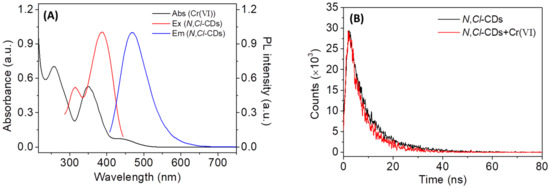 (A) The PL excitation (red line) and emission (blue line) spectra of N,Cl-CDs and UV-vis absorption spectrum of Cr(VI) (black line); (B) the fluorescence decay curves of N,Cl-CDs (1.25 mg/mL) in the absence and in the presence of 10 µM Cr(VI).