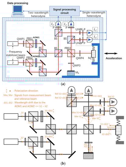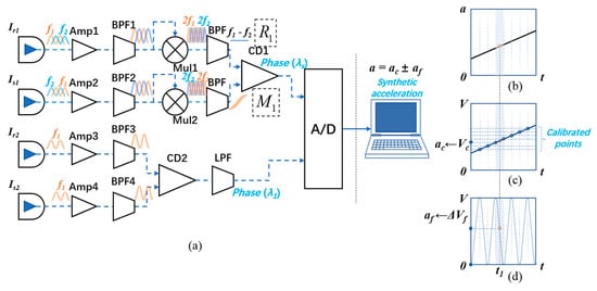 The signal process scheme is presented in Figure 2a and is composed of a synthetic wavelength superheterodyne phase detection circuit and a single wavelength heterodyne interference phase detection circuit. The detected phases via the rulers of λs and λ1 are combined to get the actual acceleration by a specific algorithm after A/D conversion.