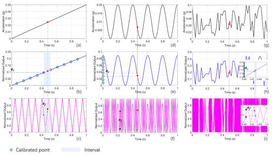 In order to better understand the process, we simulate some cases of the acceleration response. First, we set the acceleration to vary with time linearly, as shown in Figure 3a. The acceleration changes from 0 g to 0.05 g in 1 s, the acceleration-displacement sensitivity S is set to 70 μm/g [], the single wavelength is 632.8 nm, and the synthetic wavelength is 100 times the single wavelength according to our experimental setup. The normalized voltage response as a function of time via the ruler of the synthetic wavelength and the single wavelength are depicted by Figure 3b,c, respectively. It is evident that the synthetic wavelength response tracks the variable acceleration well, which means the acceleration change can be approximated by the voltage variation of the synthetic wavelength response linearly, whereas the response of the single wavelength has a lot of periods. Once the coarse acceleration detection via the synthetic wavelength is well calibrated, the output of the synthetic wavelength signal is separated into several intervals, denoted by the pink-square regions; an interval is defined by two precise calibrated points, presented by the purple circles. The coarse acceleration ac is read from the discrete point (Figure 3b), and the fine acceleration af is obtained through the variation of the output of the single wavelength (Figure 3c). The final acceleration is calculated by a = ac + af because of the positive slope of the synthetic wavelength response in this interval. Likewise, a cosinoidal acceleration and a random acceleration at a certain time, as shown in Figure 3d,g, respectively, can also be obtained through the calibrated points of the outputs of the synthetic wavelength (Figure 3e,h) and the variations of the outputs of the single wavelength in the interval, as shown in Figure 3f,i. The final accelerations are calculated by a = ac − af for the cosinoidal acceleration because of the negative slope of the response of the synthetic wavelength in the interval, while a = ac + af for the random acceleration due to the positive slope. The only difference is that the responses of the single wavelength are no longer periodic. To summarise, combining two-wavelength-based rulers as similar as the vernier caliper, this scheme enables a high-resolution acceleration measurement without compromising the NAR.