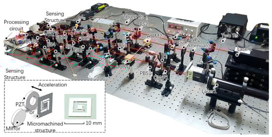 A prototype was built to verify the feasibility of this measurement technique, as shown in Figure 4. The wavelengths of laser 1 (Model 05-STP-912, Melles Griot Inc., Carlsbad, CA, USA) and laser 2 (Model MSL-FN-639-S, Changchun New Industries Optoelectronics Tech. Inc., Changchun, China) were λ1 = 632.8 nm and λ2 = 639 nm, respectively, hence the synthetic wavelength was 65.22 μm; the frequency shifts introduced by two AOMs (Qingjin Optoelectronics Tech. Inc., Shanghai, China) were f1 = 100.00 MHz and f2 = 100.05 MHz, and the frequency difference was 50 kHz, which was the heterodyne frequency; the sensing structure should be a crab-shaped cantilever-mass structure, shown in the inset of Figure 4; however, herein we replaced it by a small reflectance mirror because the prototype was not integrated; a ring piezoelectric transducer (PZT; CMBR03 Noliac Inc., Kvistgaard, Denmark) was used to apply acceleration to the sensing structure; two ultra-narrow bandwidth optical filters (Model FL05632.8-1, Thorlabs Inc., Newton, NJ, USA) with a center wavelength of 632.8 nm and full width at half maximum of 1 nm were implemented to extract the single wavelength signals. There are some slight differences between the setup and the schematic diagram. Several additional mirrors, such as “two Rs” and “three Rs”, were used to offer adjustment over multiple degrees of freedom to the laser beams; an attenuator was introduced to adjust the relative intensity of these two incident laser beams so that we could obtain a high contrast. Because the output Ir1 and Ir2 have two frequencies of around 100 MHz, two photodiodes (Model PDA10A, Thorlabs Inc., Newton, NJ, USA) with large bandwidth (larger than 300 MHz) were employed to obtain the reference signals. AD8302 was used to obtain the phase outputs of both the synthetic and single wavelength signals, whose noise level was 10 mV/degree and output range was 0 to 1.8 V.