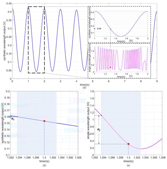 Measurement results of (a) synthetic wavelength output versus sampling time in 9 s; (b) synthetic wavelength output versus sampling time from 1 to 2 s along with calibrated intervals; (c) corresponding single wavelength output versus sampling time from 1 to 2 s. (d) Enlarged view of synthetic wave output versus sampling time from 1.292 to 1.308 s; pink area represents an interval where the specific time 1.3 s is located. (e) Enlarged view of single wave output versus sampling time from 1.292 to 1.308 s.