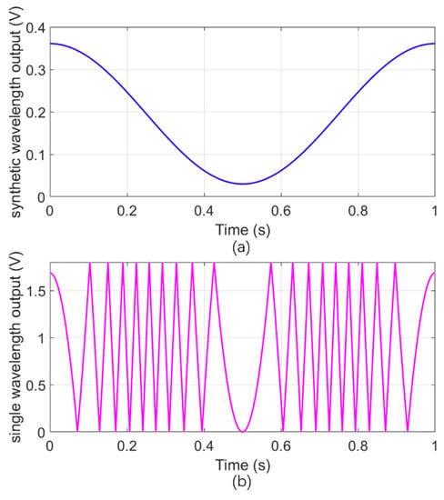 The final acceleration at 1.3 s can be calculated as ac − af = 19 mg − 0.9059 mg = 18.0941 mg. We also give the simulated response of both the synthetic wavelength and the single wavelength considering the actual parameters, as shown in Figure 6a,b. Figure 5b,c coincide well with the simulated results: the differences contain the period number of the simulation result of the synthetic wavelength in 1 s is 10, while the period number of the experimental result is 11; the amplitude of the experimental result varies with time and is slightly different from the ideal value. The former deviation could be due to the experimental errors involved in the alignment and the nonlinearity of the PZT, whereas the latter one could be due to the phase measurement and the data processing circuit errors.