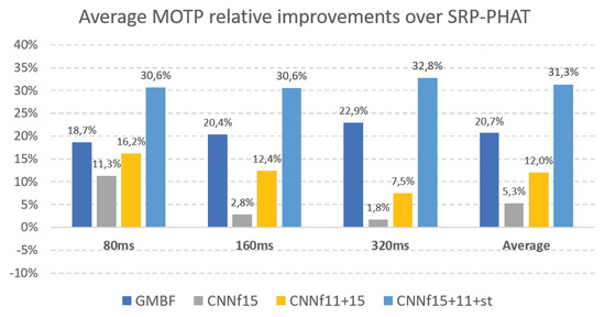 Table 9 shows the relative improvements of the proposal in Ref. [18] (column SELDnet) and our CNN approach (column CNNf15+11+st) over SRP-PHAT.