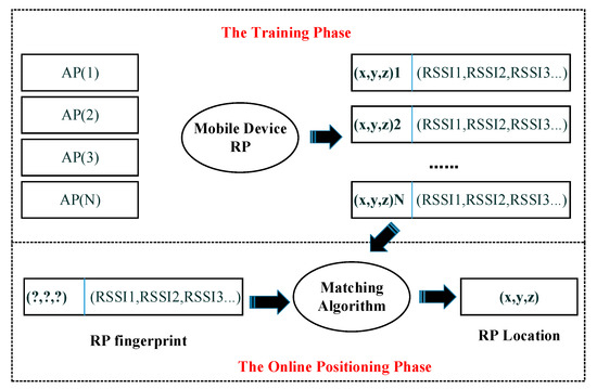 As it is shown in Figure 1, the location fingerprinting for indoor positioning system is usually achieved with two steps. Fingerprinting-based positioning is implemented in two phases: the training phase and the online positioning phase [6,7,8]. The task of the training phase is to design a sampling scheme according to the characteristics of the real indoor environment and then sampling all the sampling points in specified region with Signals of Opportunity (SOP) sensors. Finally, we can construct a location fingerprint database with recorded data, including corresponding received signal strength indicators (RSSIs), MAC address and location information, collected by sensors. In the online positioning phase, the real time Access Point (AP) signal strength and physical address information, measured by the mobile device, are utilized to match with location fingerprint database, estimating the location of the target point. Fingerprinting-based positioning technique takes advantages on low cost and high precision regardless of multipath effect and occlusion effect. However, its positioning accuracy greatly depends on the data quality of the fingerprint database so that the database need to be updated frequently due to environmental change. The establishment and maintenance of the fingerprint database seriously restricts the industrial application of the location fingerprint technology.